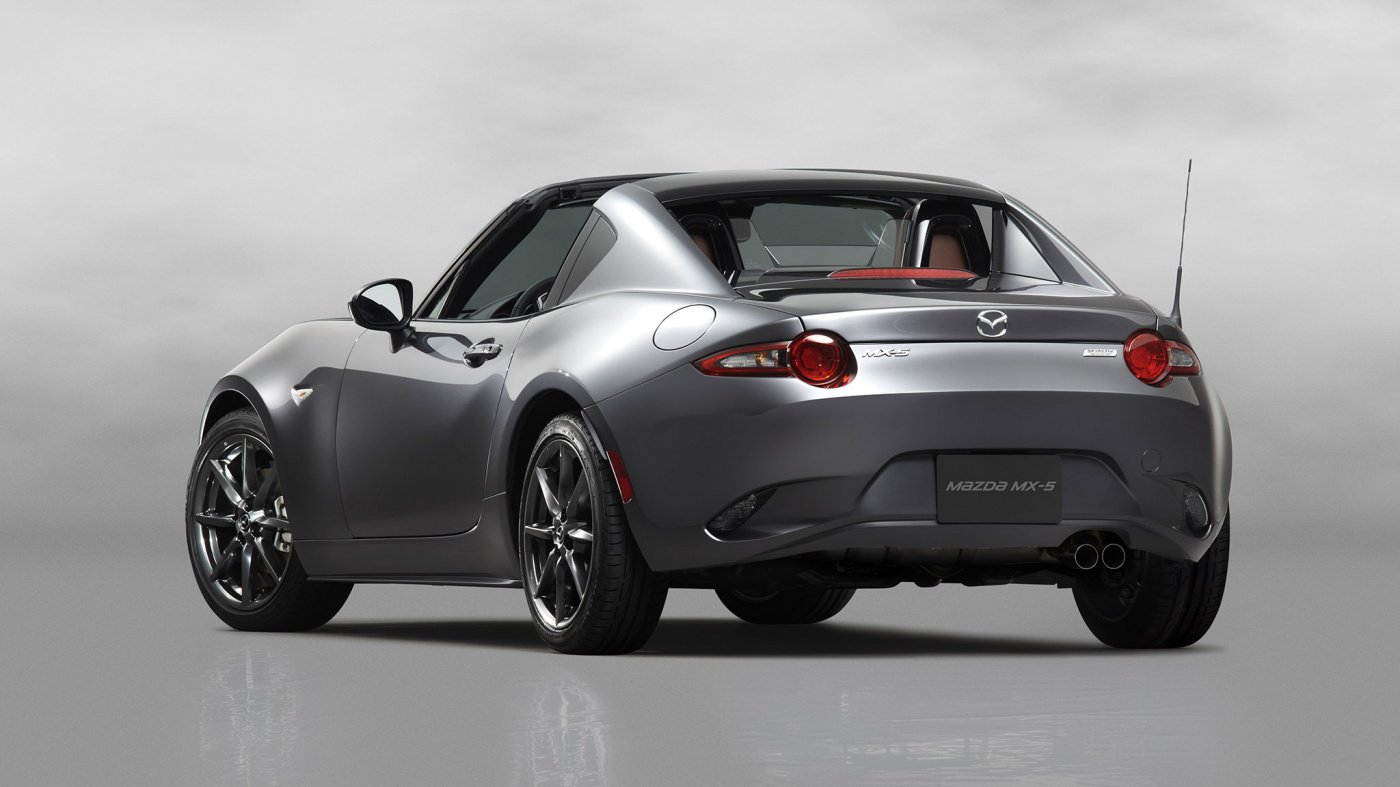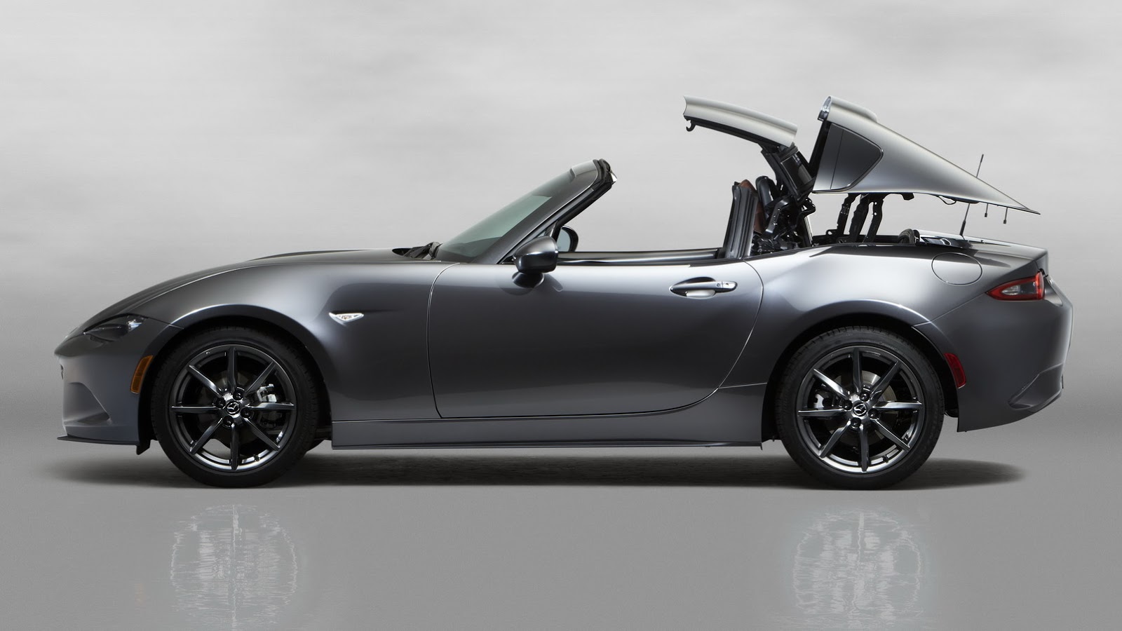 Mais contrairement à la MX5 Roadster Coupé à qui elle succède, la version RF, pour Rétractable Fastback, se différencie nettement esthétiquement de la version cabriolet-toile. Elle adopte désormais des arches arrière fixes qui glissent en pente douce (Fastback, donc) vers l’arrière de la voiture. Ce procédé nous fait penser à la Ferrari 575 Superamerica. Mais ici, le pavillon ne se retourne pas autour d’un axe. Elle est équipée d’un toit qui se plie en deux (avec la vitre arrière remplacée par une vitre ou plexiglass anti-remous), et glisse à la verticale entre le coffre et les sièges. Ainsi, une fois ouverte, elle a, d’aspect, tout ou presque d’une Targa et fermée, elle a l’allure d’un bien joli coupé !